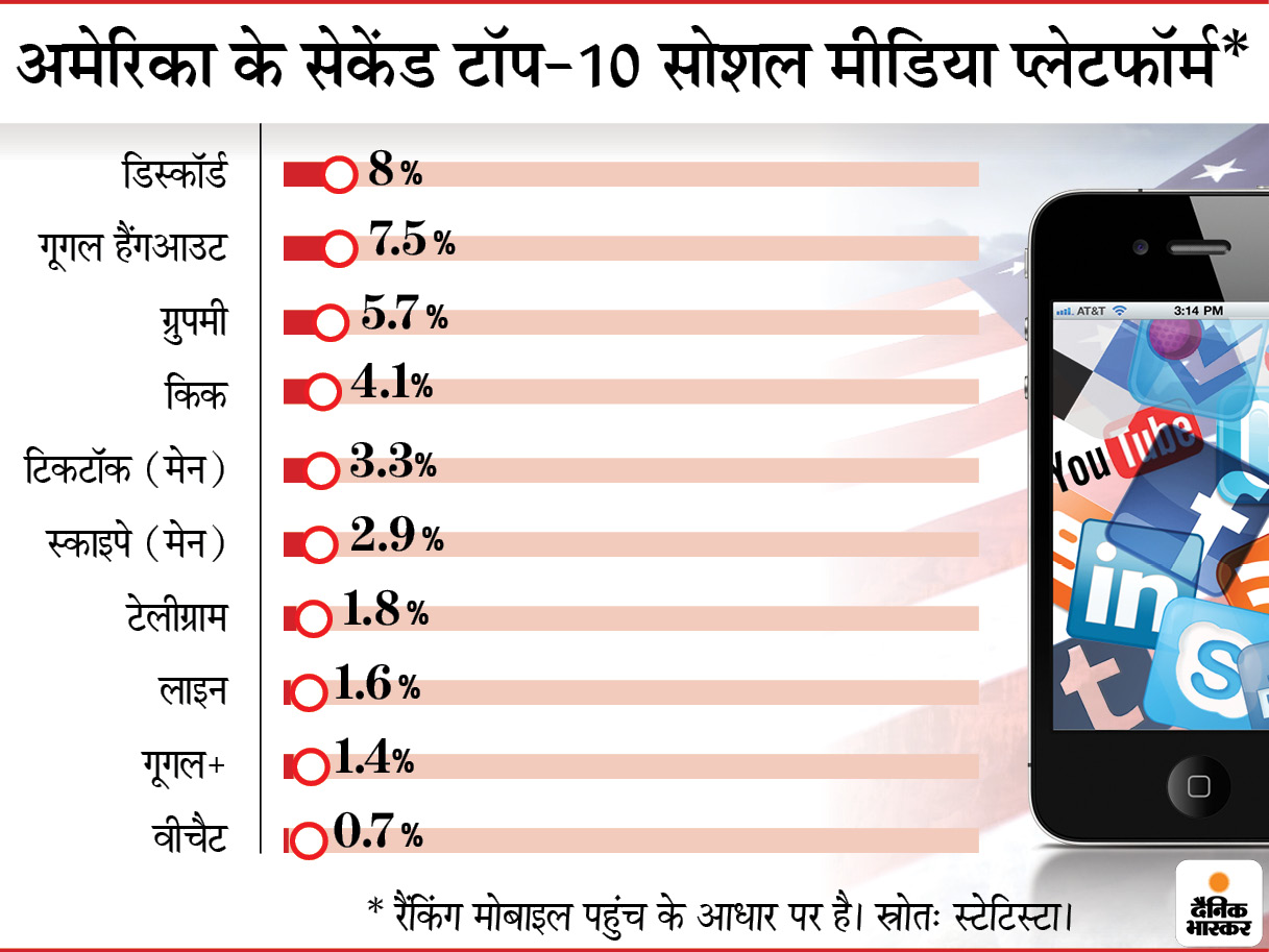 चीन के सोशल मीडिया ऐप्स पूरी दुनिया में इस्तेमाल किए जा रहे हैं। इनमें टिकटॉक, वीचैट, वीगो समेत समेत कई प्रमुख ऐप शामिल हैं। स्टेटिस्टा के डाटा के मुताबिक, अमेरिका के टॉप-20 सोशल मीडिया प्लेटफॉर्म में चीन के टिकटॉक और वीचैट के अलावा कोई बड़ा नाम शामिल नहीं है। आंकड़ों के मुताबिक, टिकटॉक के लिए चीन के बाहर अमेरिका दूसरा सबसे बड़ा बाजार है। अमेरिका में टिकटॉक के करीब 4.5 करोड़ यूजर हैं। हालांकि, अमेरिका में टिकटॉक के डाउनलोड की संख्या ज्यादा है। चीन के बाहर भारत करीब 20 करोड़ यूजर्स के साथ सबसे बड़ा बाजार है।